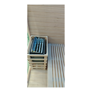 Шпоретот 9 kW со термостат, тајмер и камења обезбедува сува топлинска моќност, додека влажноста се регулира со истурање вода врз загреаните камења.