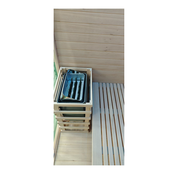 Шпоретот 9 kW со термостат, тајмер и камења обезбедува сува топлинска моќност, додека влажноста се регулира со истурање вода врз загреаните камења.
